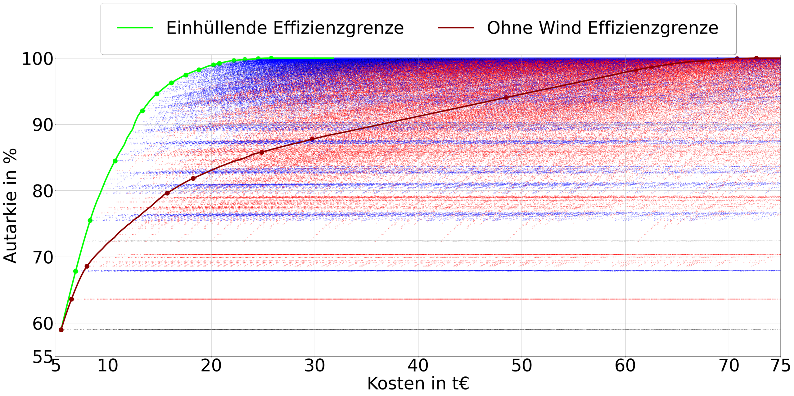 Darüber hinaus kann die Punktewolke gefiltert werden, um technologiespezifische Effizienzgrenzen zu bestimmen – etwa die Frage, welche Autarkie ohne Windenergie erreichbar ist oder wie sich der Verzicht auf chemische Langzeitspeicher auf Kosten und Autarkie auswirkt.
